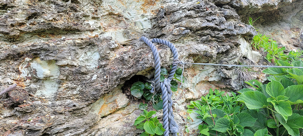 先端の防波堤に向かってコンクリート道を進んで行くと、右側の崖に、かつて船を係留していた鼻ぐり岩があります。