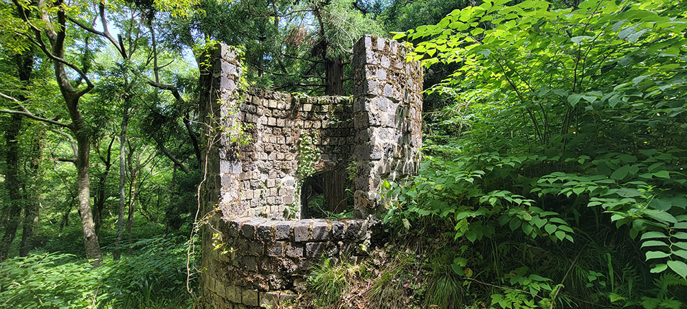 坂道を下って行くと河原付近に、レンガで作られた永久精錬所跡があります。