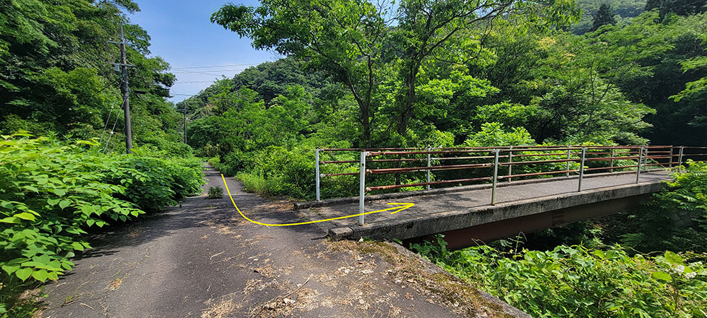 右へ(下流側)折れ、舗装道路を川沿いに進みます。