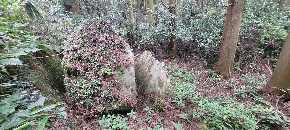 約200m進んだ辺りに石垣が散見し、それを過ぎて少し行くと、舗装道路に出ます。