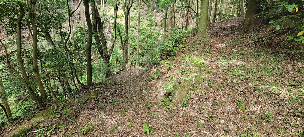 空堀は幅10mで主郭と掘との高低差が6mと深く、掘りには木橋がかけられていた可能性があります。
