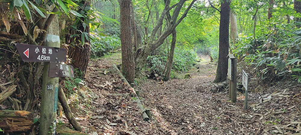約500m先が湯抱別れで、湯抱温泉(ゆがいおんせん)に入る自然歩道との分岐点です。