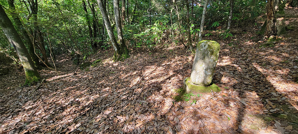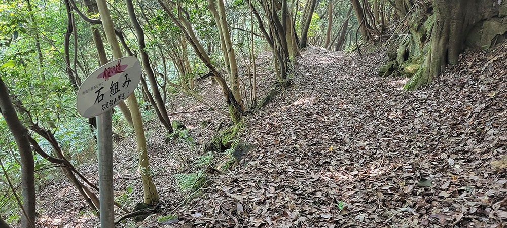やなしお道は、ここから徐々に下り始め、約800m先には街道の崩落を防ぐための人為的な石組みが見られます。